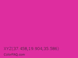 XYZ 37.458,19.904,35.586 Color is a normal magenta color and the nearest color is Frostbite #e936a7. Hex code #de2ca1 and RGB value is rgb(222,44,161). In RGB color space, this color is composed of 87% red, 17% green, 63% blue, In CMYK color space, this color is composed of 0% cyan, 80% magenta, 27% yellow , 13% black , In HSL color space, this color has a hue angle of 321° , 73% saturation and 52% lightness.