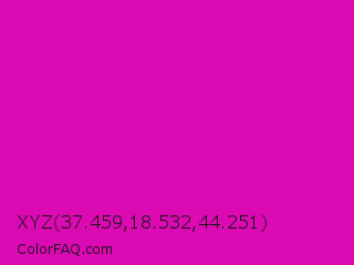 XYZ 37.459,18.532,44.251 Color is a normal magenta color and the nearest color is Deep Magenta #cc00cc. Hex code #db0ab3 and RGB value is rgb(219,10,179). In RGB color space, this color is composed of 86% red, 4% green, 70% blue, In CMYK color space, this color is composed of 0% cyan, 95% magenta, 18% yellow , 14% black , In HSL color space, this color has a hue angle of 311° , 91% saturation and 45% lightness.