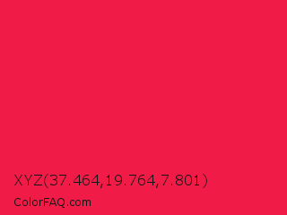 XYZ 37.464,19.764,7.801 Color is a normal red color and the nearest color is Red Crayola #ee204d. Hex code #f01b47 and RGB value is rgb(240,27,71). In RGB color space, this color is composed of 94% red, 11% green, 28% blue, In CMYK color space, this color is composed of 0% cyan, 89% magenta, 70% yellow , 6% black , In HSL color space, this color has a hue angle of 348° , 88% saturation and 52% lightness.