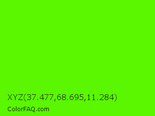 XYZ 37.477,68.695,11.284 Color is a normal green color and the nearest color is Bright Green #66ff00. Hex code #5af700 and RGB value is rgb(90,247,0). In RGB color space, this color is composed of 35% red, 97% green, 0% blue, In CMYK color space, this color is composed of 64% cyan, 0% magenta, 100% yellow , 3% black , In HSL color space, this color has a hue angle of 98° , 100% saturation and 48% lightness.