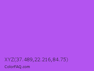 XYZ 37.489,22.216,84.75 Color is a light purple color and the nearest color is Medium Orchid #ba55d3. Hex code #b354f0 and RGB value is rgb(179,84,240). In RGB color space, this color is composed of 70% red, 33% green, 94% blue, In CMYK color space, this color is composed of 25% cyan, 65% magenta, 0% yellow , 6% black , In HSL color space, this color has a hue angle of 277° , 84% saturation and 64% lightness.