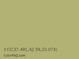 XYZ 37.491,42.59,23.074 Color is a normal yellow color and the nearest color is Misty Moss #bbb477. Hex code #b2b275 and RGB value is rgb(178,178,117). In RGB color space, this color is composed of 70% red, 70% green, 46% blue, In CMYK color space, this color is composed of 0% cyan, 0% magenta, 34% yellow , 30% black , In HSL color space, this color has a hue angle of 60° , 28% saturation and 58% lightness.
