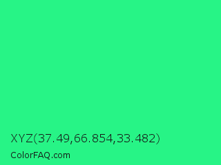 XYZ 37.49,66.854,33.482 Color is a normal green color and the nearest color is Spring Green #00ff7f. Hex code #27f486 and RGB value is rgb(39,244,134). In RGB color space, this color is composed of 15% red, 96% green, 53% blue, In CMYK color space, this color is composed of 84% cyan, 0% magenta, 45% yellow , 4% black , In HSL color space, this color has a hue angle of 148° , 90% saturation and 55% lightness.