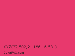 XYZ 37.502,21.186,16.581 Color is a normal rose color and the nearest color is Paradise Pink #e63e62. Hex code #e8396d and RGB value is rgb(232,57,109). In RGB color space, this color is composed of 91% red, 22% green, 43% blue, In CMYK color space, this color is composed of 0% cyan, 75% magenta, 53% yellow , 9% black , In HSL color space, this color has a hue angle of 342° , 79% saturation and 57% lightness.