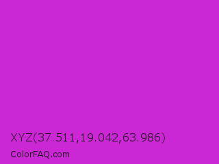 XYZ 37.511,19.042,63.986 Color is a normal magenta color and the nearest color is Steel Pink #cc33cc. Hex code #cc27d4 and RGB value is rgb(204,39,212). In RGB color space, this color is composed of 80% red, 15% green, 83% blue, In CMYK color space, this color is composed of 4% cyan, 82% magenta, 0% yellow , 17% black , In HSL color space, this color has a hue angle of 297° , 69% saturation and 49% lightness.