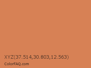 XYZ 37.514,30.803,12.563 Color is a normal orange color and the nearest color is Raw Sienna #d68a59. Hex code #d78155 and RGB value is rgb(215,129,85). In RGB color space, this color is composed of 84% red, 51% green, 33% blue, In CMYK color space, this color is composed of 0% cyan, 40% magenta, 60% yellow , 16% black , In HSL color space, this color has a hue angle of 20° , 62% saturation and 59% lightness.