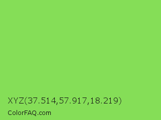 XYZ 37.514,57.917,18.219 Color is a light green color and the nearest color is Kiwi #8ee53f. Hex code #85de57 and RGB value is rgb(133,222,87). In RGB color space, this color is composed of 52% red, 87% green, 34% blue, In CMYK color space, this color is composed of 40% cyan, 0% magenta, 61% yellow , 13% black , In HSL color space, this color has a hue angle of 100° , 67% saturation and 61% lightness.