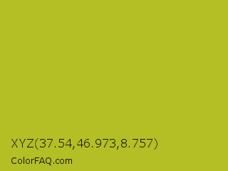 XYZ 37.54,46.973,8.757 Color is a normal yellow color and the nearest color is Acid Green #b0bf1a. Hex code #b3bf24 and RGB value is rgb(179,191,36). In RGB color space, this color is composed of 70% red, 75% green, 14% blue, In CMYK color space, this color is composed of 6% cyan, 0% magenta, 81% yellow , 25% black , In HSL color space, this color has a hue angle of 65° , 68% saturation and 45% lightness.