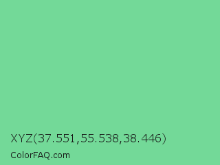 XYZ 37.551,55.538,38.446 Color is a light green color and the nearest color is Medium Aquamarine #66ddaa. Hex code #73d998 and RGB value is rgb(115,217,152). In RGB color space, this color is composed of 45% red, 85% green, 60% blue, In CMYK color space, this color is composed of 47% cyan, 0% magenta, 30% yellow , 15% black , In HSL color space, this color has a hue angle of 142° , 57% saturation and 65% lightness.