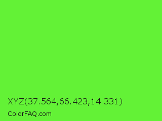 XYZ 37.564,66.423,14.331 Color is a normal green color and the nearest color is Spring Frost #87ff2a. Hex code #63f236 and RGB value is rgb(99,242,54). In RGB color space, this color is composed of 39% red, 95% green, 21% blue, In CMYK color space, this color is composed of 59% cyan, 0% magenta, 78% yellow , 5% black , In HSL color space, this color has a hue angle of 106° , 88% saturation and 58% lightness.
