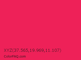 XYZ 37.565,19.969,11.107 Color is a normal rose color and the nearest color is Red Crayola #ee204d. Hex code #ee2158 and RGB value is rgb(238,33,88). In RGB color space, this color is composed of 93% red, 13% green, 35% blue, In CMYK color space, this color is composed of 0% cyan, 86% magenta, 63% yellow , 7% black , In HSL color space, this color has a hue angle of 344° , 86% saturation and 53% lightness.