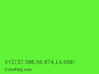 XYZ 37.588,66.874,14.668 Color is a normal green color and the nearest color is Spring Frost #87ff2a. Hex code #60f338 and RGB value is rgb(96,243,56). In RGB color space, this color is composed of 38% red, 95% green, 22% blue, In CMYK color space, this color is composed of 60% cyan, 0% magenta, 77% yellow , 5% black , In HSL color space, this color has a hue angle of 107° , 89% saturation and 59% lightness.