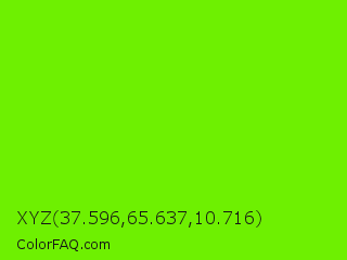 XYZ 37.596,65.637,10.716 Color is a normal green color and the nearest color is Bright Green #66ff00. Hex code #6ef001 and RGB value is rgb(110,240,1). In RGB color space, this color is composed of 43% red, 94% green, 0% blue, In CMYK color space, this color is composed of 54% cyan, 0% magenta, 100% yellow , 6% black , In HSL color space, this color has a hue angle of 93° , 99% saturation and 47% lightness.