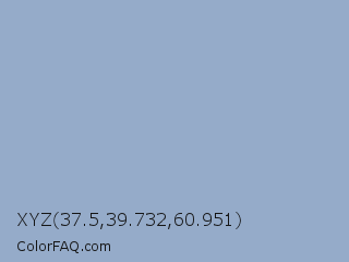 XYZ 37.5,39.732,60.951 Color is a light blue color and the nearest color is Polo Blue #8da8cc. Hex code #95abc9 and RGB value is rgb(149,171,201). In RGB color space, this color is composed of 58% red, 67% green, 79% blue, In CMYK color space, this color is composed of 26% cyan, 15% magenta, 0% yellow , 21% black , In HSL color space, this color has a hue angle of 215° , 33% saturation and 69% lightness.