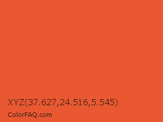 XYZ 37.627,24.516,5.545 Color is a normal red color and the nearest color is Flamingo #f2552a. Hex code #e95830 and RGB value is rgb(233,88,48). In RGB color space, this color is composed of 91% red, 35% green, 19% blue, In CMYK color space, this color is composed of 0% cyan, 62% magenta, 79% yellow , 9% black , In HSL color space, this color has a hue angle of 13° , 81% saturation and 55% lightness.