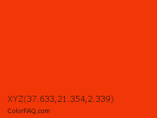 XYZ 37.633,21.354,2.339 Color is a normal red color and the nearest color is Coquelicot #ff3800. Hex code #f13607 and RGB value is rgb(241,54,7). In RGB color space, this color is composed of 95% red, 21% green, 3% blue, In CMYK color space, this color is composed of 0% cyan, 78% magenta, 97% yellow , 5% black , In HSL color space, this color has a hue angle of 12° , 94% saturation and 49% lightness.