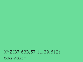 XYZ 37.633,57.11,39.612 Color is a light green color and the nearest color is Medium Aquamarine #66ddaa. Hex code #6add9a and RGB value is rgb(106,221,154). In RGB color space, this color is composed of 42% red, 87% green, 60% blue, In CMYK color space, this color is composed of 52% cyan, 0% magenta, 30% yellow , 13% black , In HSL color space, this color has a hue angle of 145° , 63% saturation and 64% lightness.