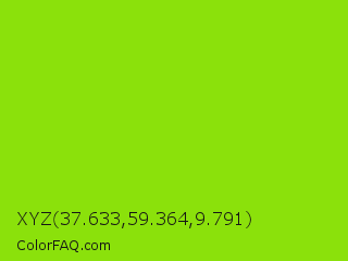 XYZ 37.633,59.364,9.791 Color is a normal green color and the nearest color is Alien Armpit #84de02. Hex code #8be10b and RGB value is rgb(139,225,11). In RGB color space, this color is composed of 55% red, 88% green, 4% blue, In CMYK color space, this color is composed of 38% cyan, 0% magenta, 95% yellow , 12% black , In HSL color space, this color has a hue angle of 84° , 91% saturation and 46% lightness.