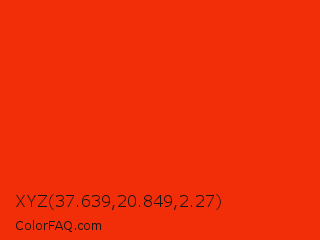 XYZ 37.639,20.849,2.27 Color is a normal red color and the nearest color is Ferrari Red #ff2800. Hex code #f22e08 and RGB value is rgb(242,46,8). In RGB color space, this color is composed of 95% red, 18% green, 3% blue, In CMYK color space, this color is composed of 0% cyan, 81% magenta, 97% yellow , 5% black , In HSL color space, this color has a hue angle of 10° , 94% saturation and 49% lightness.