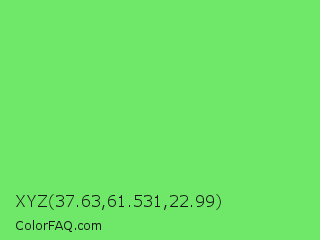 XYZ 37.63,61.531,22.99 Color is a light green color and the nearest color is Pastel Green #77dd77. Hex code #6fe768 and RGB value is rgb(111,231,104). In RGB color space, this color is composed of 44% red, 91% green, 41% blue, In CMYK color space, this color is composed of 52% cyan, 0% magenta, 55% yellow , 9% black , In HSL color space, this color has a hue angle of 117° , 73% saturation and 66% lightness.