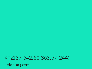 XYZ 37.642,60.363,57.244 Color is a normal cyan color and the nearest color is Turquoise PWG #30d5c8. Hex code #13e6bc and RGB value is rgb(19,230,188). In RGB color space, this color is composed of 7% red, 90% green, 74% blue, In CMYK color space, this color is composed of 92% cyan, 0% magenta, 18% yellow , 10% black , In HSL color space, this color has a hue angle of 168° , 85% saturation and 49% lightness.