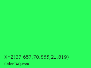 XYZ 37.657,70.865,21.819 Color is a normal green color and the nearest color is Malachite #0bda51. Hex code #29fc5c and RGB value is rgb(41,252,92). In RGB color space, this color is composed of 16% red, 99% green, 36% blue, In CMYK color space, this color is composed of 84% cyan, 0% magenta, 63% yellow , 1% black , In HSL color space, this color has a hue angle of 135° , 97% saturation and 57% lightness.