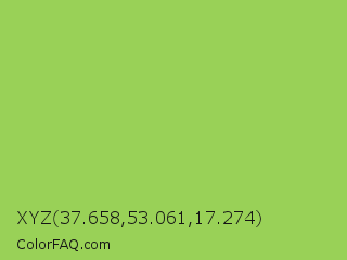 XYZ 37.658,53.061,17.274 Color is a normal green color and the nearest color is Conifer #acdd4d. Hex code #99d157 and RGB value is rgb(153,209,87). In RGB color space, this color is composed of 60% red, 82% green, 34% blue, In CMYK color space, this color is composed of 27% cyan, 0% magenta, 58% yellow , 18% black , In HSL color space, this color has a hue angle of 88° , 57% saturation and 58% lightness.