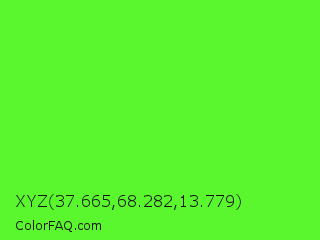 XYZ 37.665,68.282,13.779 Color is a normal green color and the nearest color is Neon Green #39ff14. Hex code #5af62e and RGB value is rgb(90,246,46). In RGB color space, this color is composed of 35% red, 96% green, 18% blue, In CMYK color space, this color is composed of 63% cyan, 0% magenta, 81% yellow , 4% black , In HSL color space, this color has a hue angle of 107° , 92% saturation and 57% lightness.