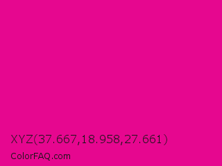 XYZ 37.667,18.958,27.661 Color is a normal magenta color and the nearest color is Mexican Pink #e4007c. Hex code #e6078f and RGB value is rgb(230,7,143). In RGB color space, this color is composed of 90% red, 3% green, 56% blue, In CMYK color space, this color is composed of 0% cyan, 97% magenta, 38% yellow , 10% black , In HSL color space, this color has a hue angle of 323° , 94% saturation and 46% lightness.