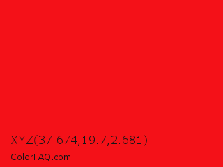 XYZ 37.674,19.7,2.681 Color is a normal red color and the nearest color is Vivid Red #f70d1a. Hex code #f41118 and RGB value is rgb(244,17,24). In RGB color space, this color is composed of 96% red, 7% green, 9% blue, In CMYK color space, this color is composed of 0% cyan, 93% magenta, 90% yellow , 4% black , In HSL color space, this color has a hue angle of 358° , 91% saturation and 51% lightness.