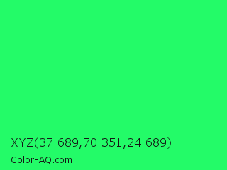 XYZ 37.689,70.351,24.689 Color is a normal green color and the nearest color is Spring Green #00ff7f. Hex code #23fb68 and RGB value is rgb(35,251,104). In RGB color space, this color is composed of 14% red, 98% green, 41% blue, In CMYK color space, this color is composed of 86% cyan, 0% magenta, 59% yellow , 2% black , In HSL color space, this color has a hue angle of 139° , 96% saturation and 56% lightness.