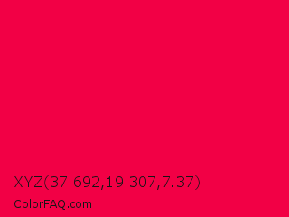 XYZ 37.692,19.307,7.37 Color is a normal rose color and the nearest color is Red Munsell #f2003c. Hex code #f20045 and RGB value is rgb(242,0,69). In RGB color space, this color is composed of 95% red, 0% green, 27% blue, In CMYK color space, this color is composed of 0% cyan, 100% magenta, 71% yellow , 5% black , In HSL color space, this color has a hue angle of 343° , 100% saturation and 47% lightness.