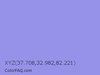 XYZ 37.708,32.982,82.221 Color is a light indigo color and the nearest color is Portage #8b9fee. Hex code #9692ea and RGB value is rgb(150,146,234). In RGB color space, this color is composed of 59% red, 57% green, 92% blue, In CMYK color space, this color is composed of 36% cyan, 38% magenta, 0% yellow , 8% black , In HSL color space, this color has a hue angle of 243° , 68% saturation and 75% lightness.