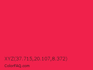 XYZ 37.715,20.107,8.372 Color is a normal red color and the nearest color is Red Crayola #ee204d. Hex code #f0214a and RGB value is rgb(240,33,74). In RGB color space, this color is composed of 94% red, 13% green, 29% blue, In CMYK color space, this color is composed of 0% cyan, 86% magenta, 69% yellow , 6% black , In HSL color space, this color has a hue angle of 348° , 87% saturation and 54% lightness.