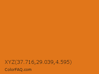 XYZ 37.716,29.039,4.595 Color is a normal orange color and the nearest color is Tango #ed7a1c. Hex code #e1761a and RGB value is rgb(225,118,26). In RGB color space, this color is composed of 88% red, 46% green, 10% blue, In CMYK color space, this color is composed of 0% cyan, 48% magenta, 88% yellow , 12% black , In HSL color space, this color has a hue angle of 28° , 79% saturation and 49% lightness.