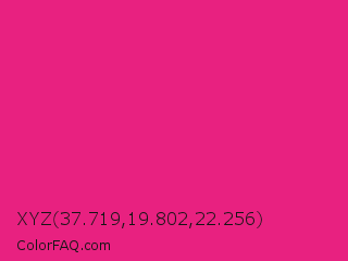 XYZ 37.719,19.802,22.256 Color is a normal rose color and the nearest color is Barbie Pink #e0218a. Hex code #e82180 and RGB value is rgb(232,33,128). In RGB color space, this color is composed of 91% red, 13% green, 50% blue, In CMYK color space, this color is composed of 0% cyan, 86% magenta, 45% yellow , 9% black , In HSL color space, this color has a hue angle of 331° , 81% saturation and 52% lightness.