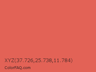 XYZ 37.726,25.738,11.784 Color is a light red color and the nearest color is Roman #de6360. Hex code #e36256 and RGB value is rgb(227,98,86). In RGB color space, this color is composed of 89% red, 38% green, 34% blue, In CMYK color space, this color is composed of 0% cyan, 57% magenta, 62% yellow , 11% black , In HSL color space, this color has a hue angle of 5° , 72% saturation and 61% lightness.