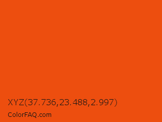 XYZ 37.736,23.488,2.997 Color is a normal orange color and the nearest color is Trinidad #e64e03. Hex code #ed4e0f and RGB value is rgb(237,78,15). In RGB color space, this color is composed of 93% red, 31% green, 6% blue, In CMYK color space, this color is composed of 0% cyan, 67% magenta, 94% yellow , 7% black , In HSL color space, this color has a hue angle of 17° , 88% saturation and 49% lightness.