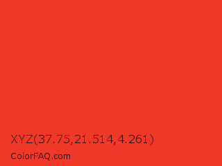 XYZ 37.75,21.514,4.261 Color is a normal red color and the nearest color is Pomegranate #f34723. Hex code #f03829 and RGB value is rgb(240,56,41). In RGB color space, this color is composed of 94% red, 22% green, 16% blue, In CMYK color space, this color is composed of 0% cyan, 77% magenta, 83% yellow , 6% black , In HSL color space, this color has a hue angle of 5° , 87% saturation and 55% lightness.