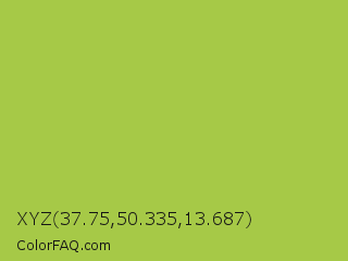 XYZ 37.75,50.335,13.687 Color is a normal lime color and the nearest color is Android Green #a4c639. Hex code #a6c947 and RGB value is rgb(166,201,71). In RGB color space, this color is composed of 65% red, 79% green, 28% blue, In CMYK color space, this color is composed of 17% cyan, 0% magenta, 65% yellow , 21% black , In HSL color space, this color has a hue angle of 76° , 55% saturation and 53% lightness.