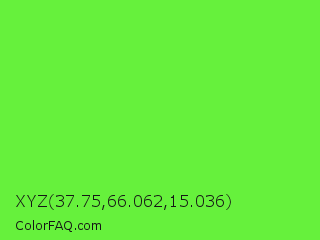 XYZ 37.75,66.062,15.036 Color is a normal green color and the nearest color is Spring Frost #87ff2a. Hex code #66f13c and RGB value is rgb(102,241,60). In RGB color space, this color is composed of 40% red, 95% green, 24% blue, In CMYK color space, this color is composed of 58% cyan, 0% magenta, 75% yellow , 5% black , In HSL color space, this color has a hue angle of 106° , 87% saturation and 59% lightness.