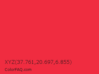XYZ 37.761,20.697,6.855 Color is a normal red color and the nearest color is Imperial Red #ed2939. Hex code #f02c40 and RGB value is rgb(240,44,64). In RGB color space, this color is composed of 94% red, 17% green, 25% blue, In CMYK color space, this color is composed of 0% cyan, 82% magenta, 73% yellow , 6% black , In HSL color space, this color has a hue angle of 354° , 87% saturation and 56% lightness.
