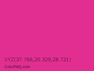 XYZ 37.766,20.329,28.721 Color is a normal magenta color and the nearest color is Cerise #da3287. Hex code #e32e91 and RGB value is rgb(227,46,145). In RGB color space, this color is composed of 89% red, 18% green, 57% blue, In CMYK color space, this color is composed of 0% cyan, 80% magenta, 36% yellow , 11% black , In HSL color space, this color has a hue angle of 327° , 76% saturation and 54% lightness.