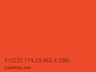 XYZ 37.774,23.062,4.558 Color is a normal red color and the nearest color is Pomegranate #f34723. Hex code #ed4a29 and RGB value is rgb(237,74,41). In RGB color space, this color is composed of 93% red, 29% green, 16% blue, In CMYK color space, this color is composed of 0% cyan, 69% magenta, 83% yellow , 7% black , In HSL color space, this color has a hue angle of 10° , 84% saturation and 55% lightness.