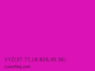 XYZ 37.77,18.829,45.36 Color is a normal magenta color and the nearest color is Deep Magenta #cc00cc. Hex code #db12b5 and RGB value is rgb(219,18,181). In RGB color space, this color is composed of 86% red, 7% green, 71% blue, In CMYK color space, this color is composed of 0% cyan, 92% magenta, 17% yellow , 14% black , In HSL color space, this color has a hue angle of 311° , 85% saturation and 46% lightness.