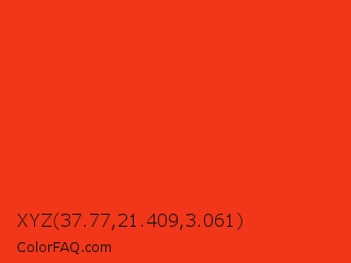 XYZ 37.77,21.409,3.061 Color is a normal red color and the nearest color is Pomegranate #f34723. Hex code #f13619 and RGB value is rgb(241,54,25). In RGB color space, this color is composed of 95% red, 21% green, 10% blue, In CMYK color space, this color is composed of 0% cyan, 78% magenta, 90% yellow , 5% black , In HSL color space, this color has a hue angle of 8° , 89% saturation and 52% lightness.