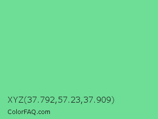 XYZ 37.792,57.23,37.909 Color is a light green color and the nearest color is Medium Aquamarine #66ddaa. Hex code #6edd96 and RGB value is rgb(110,221,150). In RGB color space, this color is composed of 43% red, 87% green, 59% blue, In CMYK color space, this color is composed of 50% cyan, 0% magenta, 32% yellow , 13% black , In HSL color space, this color has a hue angle of 142° , 62% saturation and 65% lightness.