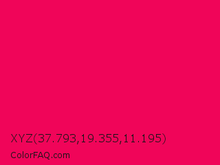 XYZ 37.793,19.355,11.195 Color is a normal rose color and the nearest color is Razzmatazz Crayola #e30b5c. Hex code #f00559 and RGB value is rgb(240,5,89). In RGB color space, this color is composed of 94% red, 2% green, 35% blue, In CMYK color space, this color is composed of 0% cyan, 98% magenta, 63% yellow , 6% black , In HSL color space, this color has a hue angle of 339° , 96% saturation and 48% lightness.