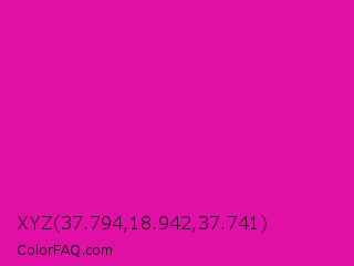 XYZ 37.794,18.942,37.741 Color is a normal magenta color and the nearest color is Hollywood Cerise #f400a1. Hex code #e00fa6 and RGB value is rgb(224,15,166). In RGB color space, this color is composed of 88% red, 6% green, 65% blue, In CMYK color space, this color is composed of 0% cyan, 93% magenta, 26% yellow , 12% black , In HSL color space, this color has a hue angle of 317° , 87% saturation and 47% lightness.