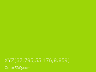 XYZ 37.795,55.176,8.859 Color is a normal lime color and the nearest color is Vivid Lime Green #a6d608. Hex code #9cd607 and RGB value is rgb(156,214,7). In RGB color space, this color is composed of 61% red, 84% green, 3% blue, In CMYK color space, this color is composed of 27% cyan, 0% magenta, 97% yellow , 16% black , In HSL color space, this color has a hue angle of 77° , 94% saturation and 43% lightness.